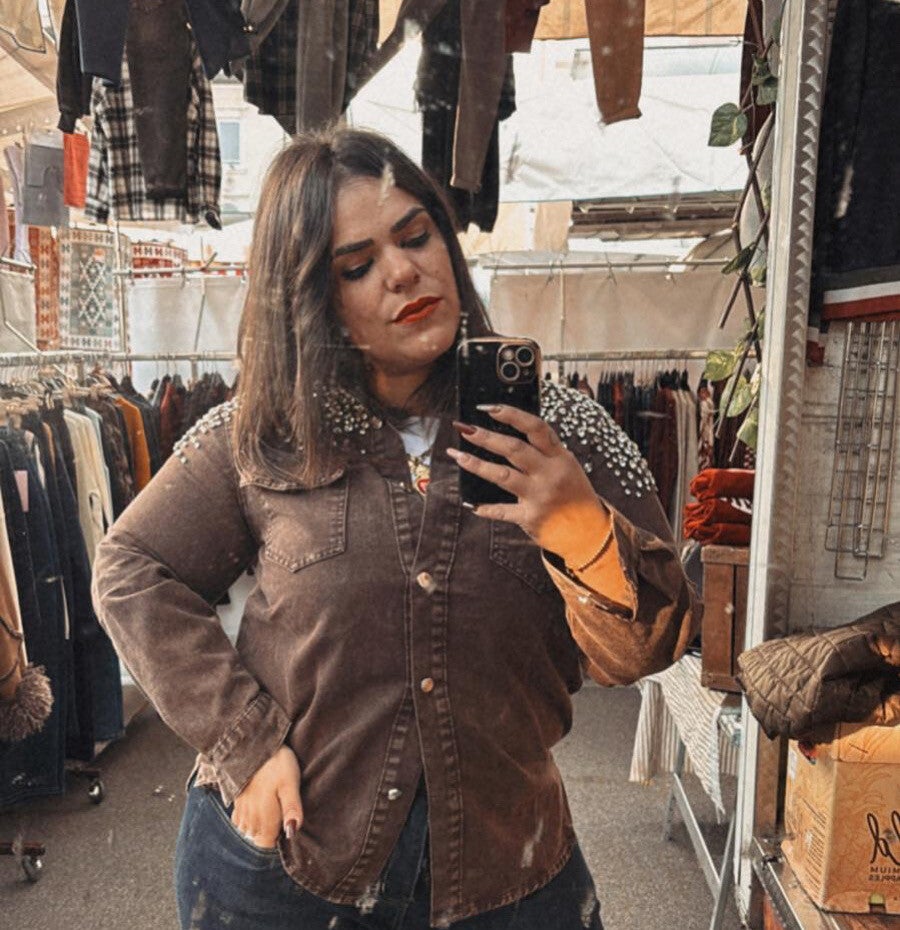 Questa camicia in denim è tutto quello che serve per dare luce ai tuoi outfit autunnali — il dettaglio brillante sulle spalle fa la differenza.